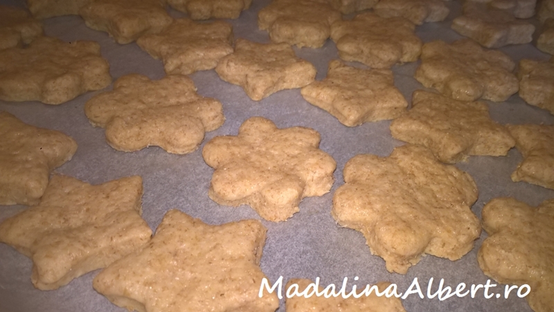 Se întinde foaia de aluat pe blatul de lucru și se decupează biscuiții în formele dorite. Se pun în tavă pe hârtie de copt și se dau la cuptorul preîncălzit la foc mediu (180 de grade) pentru aproximativ 12 minute (până se rumenesc ușor dedesubt).