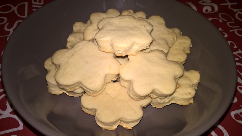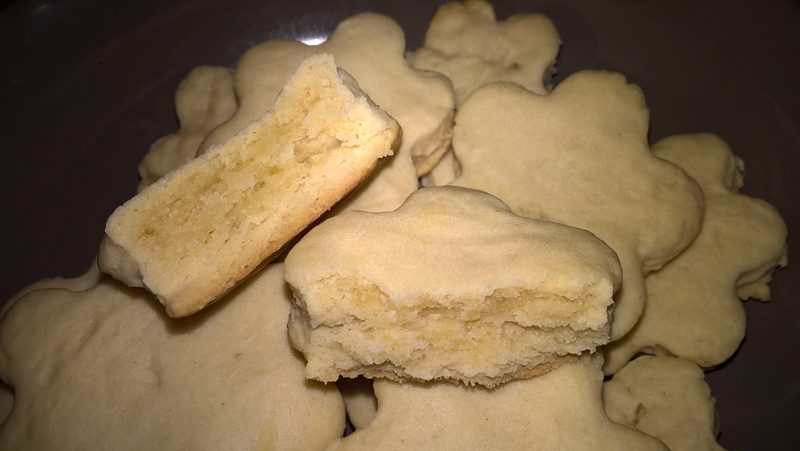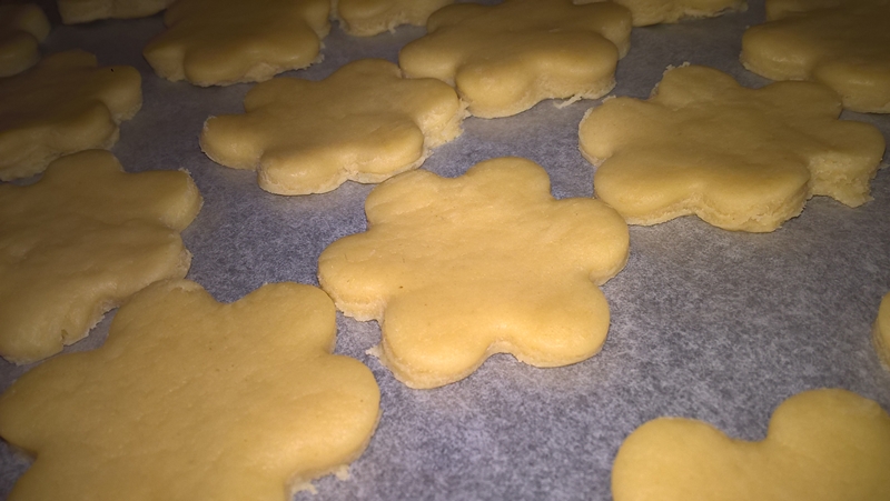 Se întinde apoi o foaie de 0,5-0,8 cm. grosime și se decupează biscuiții în formele dorite. Se pun în tavă pe hărtie de copt și se dau la cuptorul preîncălzit la foc mediu (180 de grade) pentru aproximativ 12 minute (până se rumenesc ușor dedesubt). Se lasă la răcit în tavă și apoi se servesc.