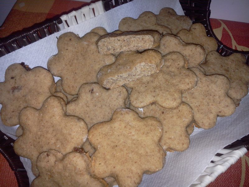 Se încorporează etapizat făina cât „cere” aluatul. Eu am pus prima data făina de ovaz și am completat cu cea de grâu. Nu-mi plac biscuiții cu prea multă făină de ovăz – îmi par o idee înecăcioși, dar se pretează bine pentru a fi pasați în iaurt (sunt o idee sfărâmicioși, depinde cu ce ingrediente mai sunt asociați în rețetă). După ce s-a format coca, se pudrează cu făină pe blatul de lucru, se întinde foaia de aluat și se taie în formele dorite. Se pun biscuiții pe hârtie de copt într-o tavă și se dau la cuptor pentru 10-12 min. (cuptorul să fie încălzit înainte și tava se pune la un nivel mai înalt în cuptor să nu se rumenească).