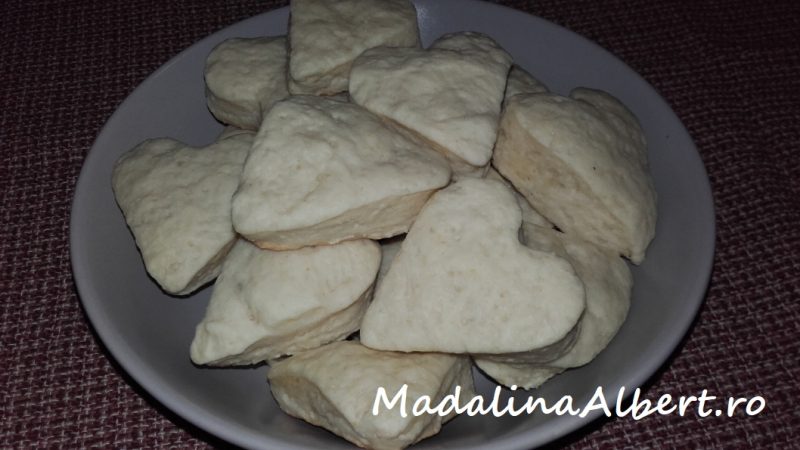 Se întinde foaia de aluat de aproximativ 0.8cm. grosime și se decupează în formele dorite. Se pun biscuiții în tavă pe hârtie de copt și se dau la cuptorul preîncălzit la foc mediu (180 de grade) pentru aproximativ 15-20 de minute (până se rumenesc ușor dedesubt).