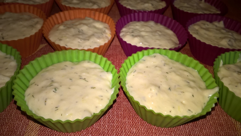 Se pune compoziția în forme de silicon pentru brioșe (dacă se folosesc forme de hârtie se ung înainte de a pune compoziția cu ulei de măsline).