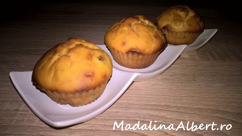 Se pune compoziția în forme de silicon pentru brioșe și se dau la cuptorul preîncălzit la foc mediu (180 de grade) pentru aproximativ 35 de minute până se rumenesc frumos și trec testul scobitorii.