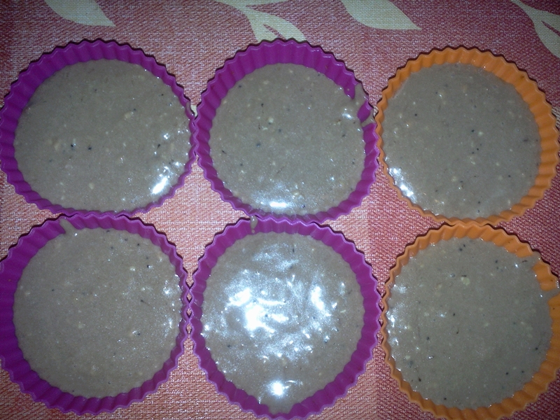 Se încălzește cuptorul și se pune compoziția în forme de brioșe. Eu am folosit forme de silicon și de hârtie – formele de hârtie le-am uns cu puțin ulei pentru a fi mai ușor de scos brioșa la sfârșit (în cazul formelor de silicon nu a fost nevoie).
