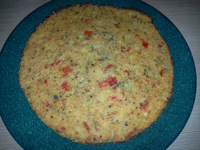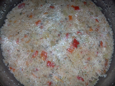 Se amestecă ingredientele – cous-cous-ul cu ardeii, ceapa, roșia pasată, fulgii de drojdie inactivă, puțin ulei de măsline și verdeața. Se tapetează un vas termorezistent cu unt și pesmet. Se pune compoziția în vas, se acoperă vasul și se dă la cuptorul preîncălzit timp de 20 de minute la foc mediu. Se mai lasă apoi 10 minute la cuptor (fără capac) până se rumenește ușor pe margini.