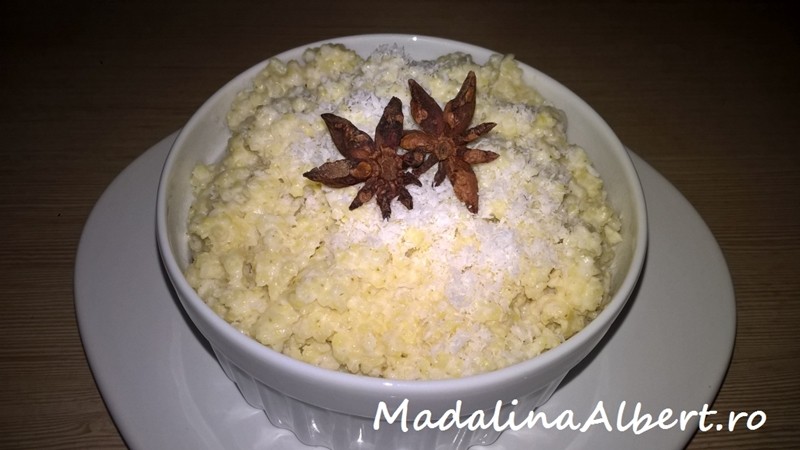 Se lasă meiul la hidratat cu o seară înainte în apă cu puțină zeamă de lămâie. A doua zi se clătește bine și se pune meiul la fiert în lapte. Se adaugă steluțele de anason, puțină scorțișoară și se lasă vasul pe foc mic amestecând constant până se îngroașă budinca (aproximativ 20 de minute). Se ia vasul de pe foc, se scot steluțele de anason și se aruncă. Se adaugă fulgii și uleiul de cocos și se amestecă.