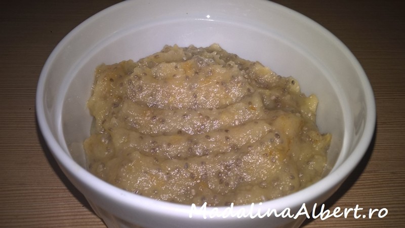 Se spală bine merele și se coc în cuptor la foc mediu (180 de grade) până intră ușor furculița în ele (aproximativ 15 minute). Se lasă la răcit, se curăță de cotor și coajă și se pasează (din cele două mere am obținut 150g. piure de mere). Se adaugă semințele de chia și puțină pudră de scorțișoară.