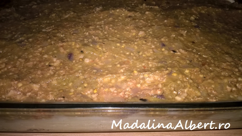 Se tapetează un vas termorezistent cu unt și se așează stratul de piure de cartofi. Se pune deasupra sosul cu vinete și carne de porc și câteva felii de unt. Se acoperă vasul și se dă la cuptorul preîncălzit la foc mediu (180 de grade) pentru aproximativ 30 de minute. Se mai lasă apoi budinca la cuptor pentru aproximativ 30 de minute. Se lasă la răcit 15-20 de minute și se servește.