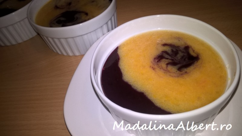 Se amestecă o jumătate de budincă cu afinele și puțin extract de vanilie și se pasează compoziția. A doua jumătate se amestecă cu dovleacul plăcintar copt și cu puțină scorțișoară și se pasează.