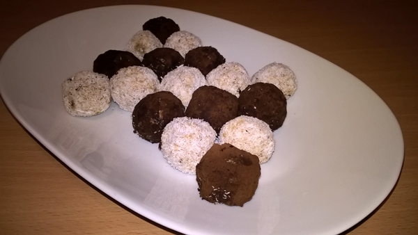 Se pun 50g. fulgi de cocos într-un bol și 50g. de carob (pudră de roșcove) în alt bol. Se trec mâinile sub jet de apă și se modelează din compoziție formând bile de mărimea dorită (eu am obținut 30 de bulete – am folosit aproximativ jumătate de lingură de compoziție pentru fiecare). Se trec bilele prin fulgii de cocos, respectiv prin carob și apoi se pun pe un platou. Se dau buletele la frigider pentru aproximativ o oră și apoi se servesc.