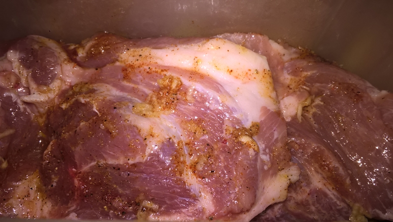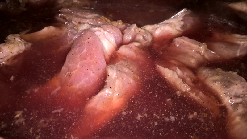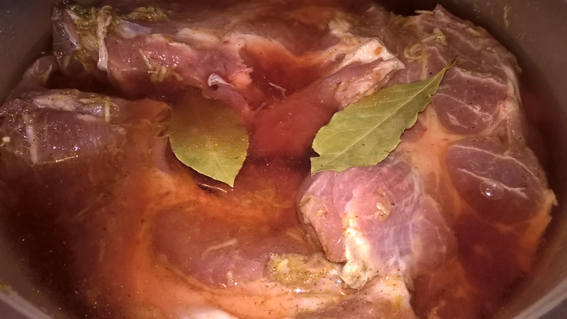 Se taie ceafa de porc felii de un deget grosime. Se amestecă sosul de roșii cu uleiul de măsline, usturoiul curățat și pisat și condimentele. Se freacă cu mâinile bucățile de carne și se așează într-un vas. Se așează deasupra foile de dafin, se acoperă carnea cu vin și se dă vasul acoperit la frigider până a doua zi.