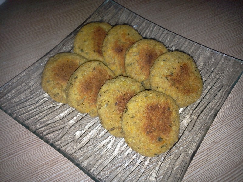 Compoziția este ușor cremoasă. Se adaugă pesmetul etapizat cât cere compoziția. Se modelează chifteluțele cu mâna trecută prin ulei și se pun pe hârtie de copt. Se dau la cuptorul preîncălzit la foc mediu pentru 20 de minute până se rumenesc ușor dedesubt, apoi se intorc și se mai dau la cuptor 10 minute. Se lasă la răcit în tavă. Se pot servi cu sos de roșii sau diverse legume.