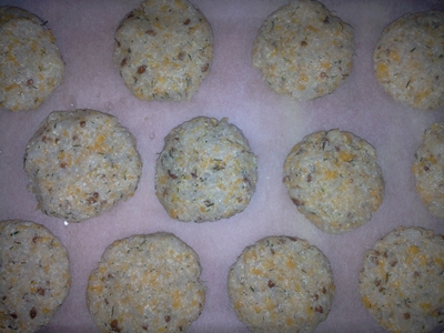 Se tapetează cu hârtie de copt o tavă și se încălzește cuptorul. Se formează chifteluțele și se pun în vas. Se pun la cuptor la foc mediu pentru 20-25 de minute până sunt rumenite ușor dedesubt, apoi se întorc cu o spatulă și se mai lasă la cuptor pentru 10 minute. Se lasă la răcit în tavă și apoi se pot servi simple, cu iaurt sau cu sos de roșii.