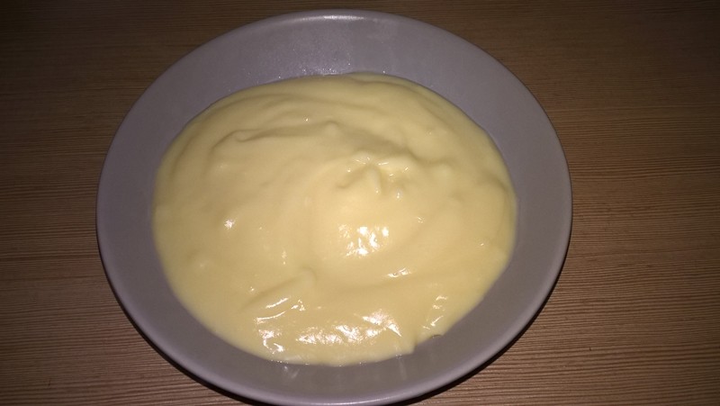 Se pun 400ml. de lapte la fiert. Când acesta este fierbinte se adaugă crema de mai sus și se amestecă constant să nu se formeze cocoloașe până se îngroașă. La sfârșit se adaugă extractul de vanilie sau esența. Se pune crema într-un vas și se acoperă cu folie alimentară.