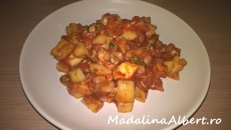 Se curăță dovleceii de coajă și se taie cubulețe. Se presară puțină sare peste dovlecei și se lasă 10 minute până „transpiră”. Se scurge apoi zeama lăsată de dovlecei printr-o sită.