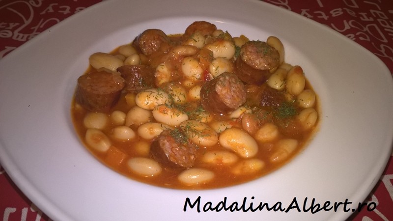 Se taie cârnații felii de 1cm. grosime și se frig într-o tigaie antiaderentă încinsă (fără adaos de apă sau ulei). Se adaugă bucățile de cărnați în vasul cu fasole și se mai lasă pe foc mâncarea până se îngroașă ușor sosul. Se oprește focul și se adaugă cimbru și mărar.