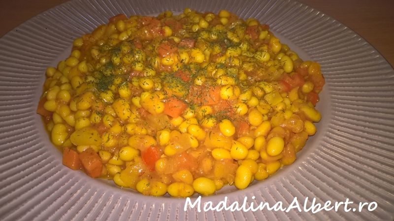 Se lasă să scadă și apoi se pune sosul de roșii, pasta de ardei, puțin turmeric și cimbru. Se mai lasă pe foc până se îngroașă ușor sosul de roșii. Se oprește focul și se adaugă puțin ulei de măsline și mărar.