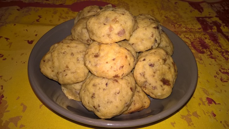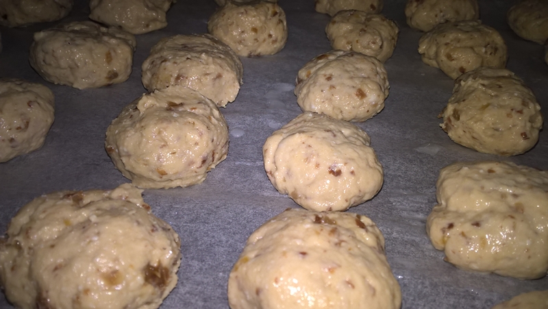 Se trec mâinile sub jet de apă și se formează mici biluțe de aluat. Se aplatizează ușor și se așează în tavă pe hârtie de copt. Se dă tava la cuptorul preîncălzit la foc mediu (180 de grade) pentru aproximativ 15 minute (până se rumenesc ușor dedesubt). Se lasă la răcit și apoi se servesc.