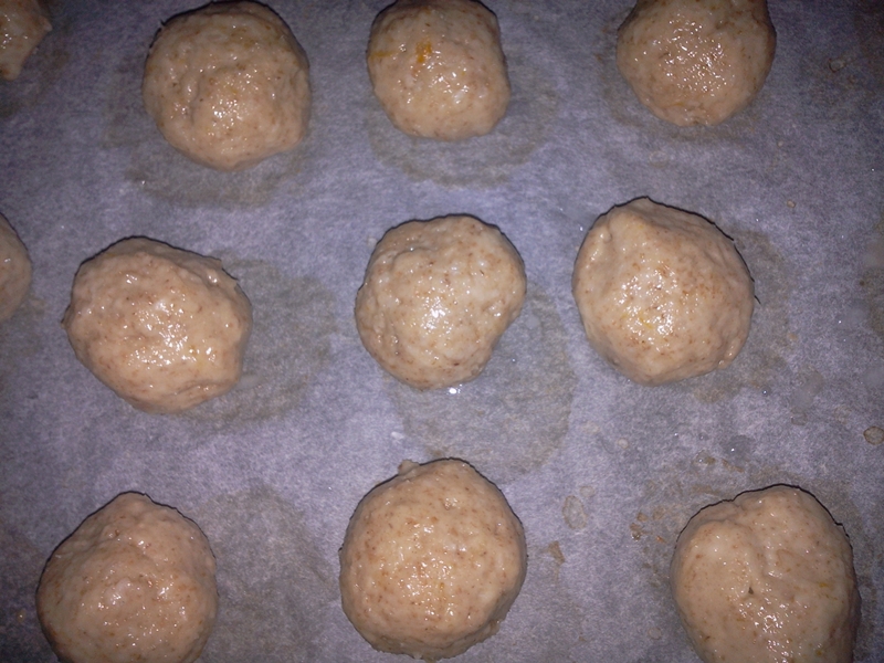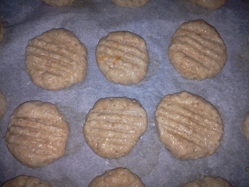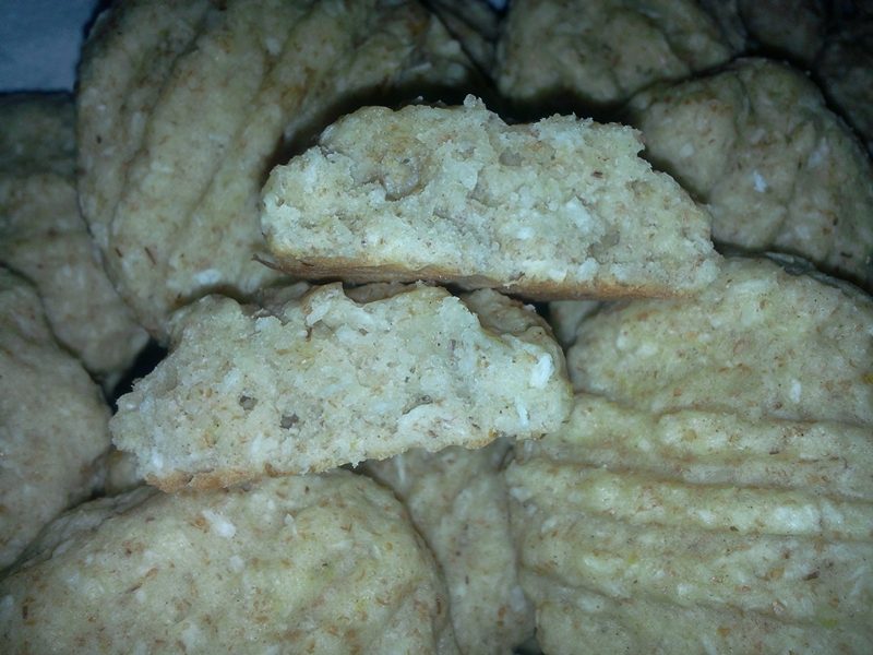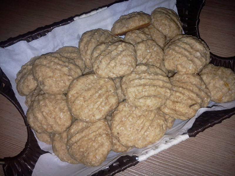 Se amestecă oul cu untul la temperatura camerei. Se adaugă banana pasată cu furculița și fulgii de cocos. Se încorporează zahărul brut, oul, coaja rasă de la o portocală, o jumătate de plic praf de copt și laptele. Se completează cu făina integrală etapizat până se obține o consistență cremoasă ca la chifteluțe (nu trebuie sa fie prea tare pentru a obține fursecuri fragede, trebuie o consistență care se poate modela ușor cu mâinile). Se trec mâinile sub jet de apă și se formează mici biluțe. Se așează acestea în tavă pe hârtie de copt și se aplatizează ușor cu furculița (trecută din cand în când sub jet de apă). Se dă tava la cuptorul preîncălzit la foc mediu pentru 10-12 minute la un nivel mai înalt până se rumenesc ușor pe margini.
