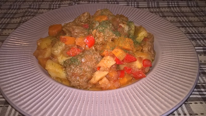 După 90 de minute se adaugă în vas rădăcinoasele, ceapa și roșiile pasate (se verifică carnea să fie aproape fiartă înainte de a adăuga legumele – dacă nu este suficient se poate mări timpul de fierbere). După 15 minute se adaugă ardeii, cartofii și 2 foi de dafin. Se lasă vasul pe foc până legumele sunt bine fierte, se adaugă sare după gust, boia dulce și piper. Se stropește cu puțin ulei de măsline, se presară mărar și se servește.