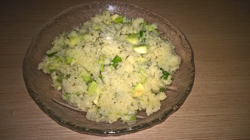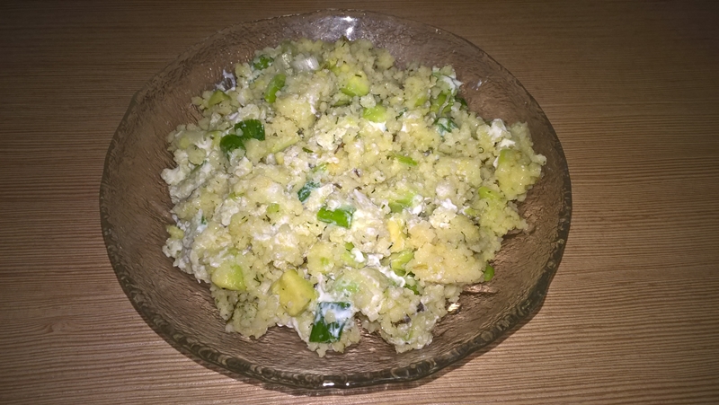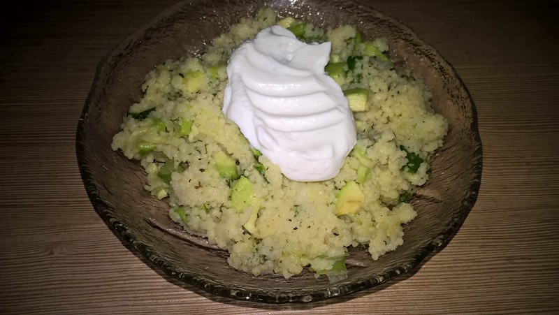 Se adaugă peste cous-cous-ul fierbinte cașcavalul, apoi avocado, ceapa și mirodeniile. Noi am servit cu o lingură de iaurt grecesc.