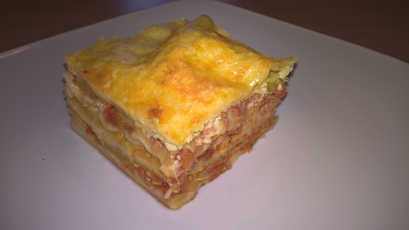 Se așează un strat de foi de lasagna (eu am folosit foi care nu necesitau fierte înainte – vă raportați în funcție de foile folosite). Se pune deasupra sos de roșii, se nivelează și apoi se așează un strat de felii de dovlecei și un strat de brânză. Se repetă procedeul până se termină de asamblat lasagna. Deasupra ultimului strat de foi de lasagna se așează un strat de sos de brânză.