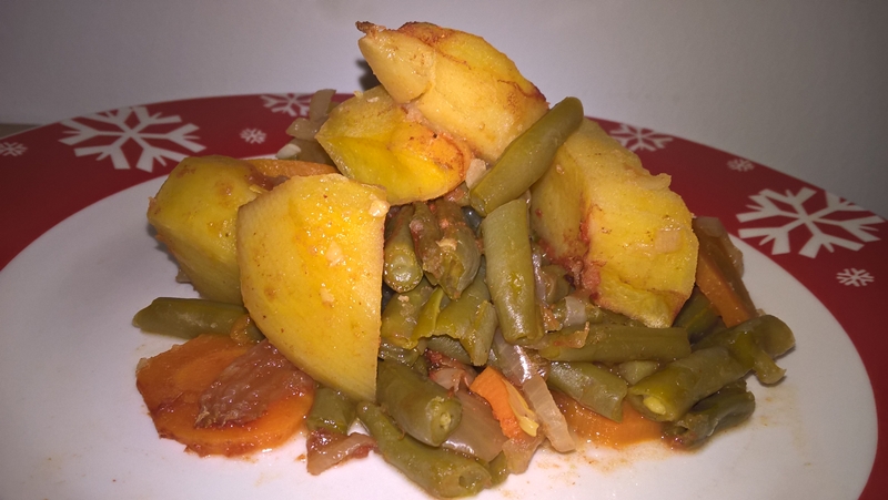 Se curăță cartofii, morcovul și ceapa. Se spală și se taie bucăți (am tăiat cartofii cuburi, morcovul felii subțiri, iar ceapa solzișori). Am folosit fasole verde congelată.