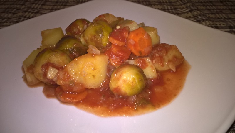 Se pune o cană de apă într-un vas și se adaugă ceapa, usturoiul și morcovii. Se lasă la fiert aproximativ 15 minute, apoi se adaugă cartofii, varza de Bruxelles (eu am folosit congelată; am adăugat-o congelată în vas pe foc), roșiile pasate, sare după gust și puțină boia dulce.