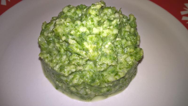 Se strecoară surplusul de apă (dacă este cazul), se adaugă spanacul și se mai lasă pe foc 2 minute. Se oprește focul și se adaugă smântână și untul.