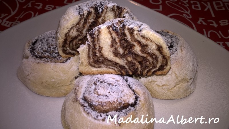Se pudrează blatul de lucru cu făină (pentru pudrarea blatului de lucru am folosit aproximativ 100g.). Se împarte aluatul în două bucăți și se întinde o foaie subțire. Se pune desupra jumătate din umplutura cu nucă și magiun și se rulează. Se taie în 10 bucăți și se așează melcișorii în tavă pe hârtie de copt. Se repetă procedeul și cu cealaltă parte de aluat și umplutura rămasă. Se lasă melcișorii la crescut în tavă aproximativ 15 minute și apoi se dă tava la cuptorul preîncălzit la foc mediu pentru 25-30 de minute. Se lasă la răcit în tavă și apoi se servesc.