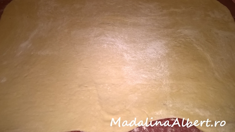Se amestecă apa călduță cu 200g. făină, drojdia și zahărul. Se lasă deoparte 10 minute până se activează drojdia și apoi se adaugă o lingură extract de vanilie și etapizat diferența de făină. Se adaugă uleiul de floarea-soarelui și se frământă până se desprinde ușor aluatul de pe mâini. Se acoperă vasul și se lasă la dospit la loc călduț aproximativ o oră până își dublează volumul.