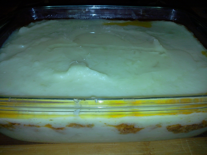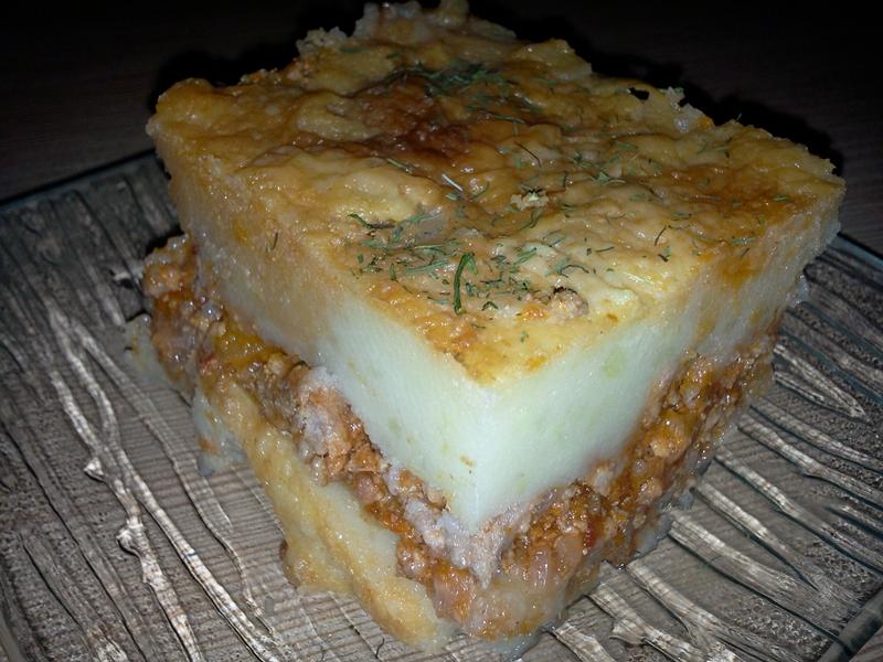 Se tapetează un vas termorezistent cu unt și se pune jumătate din piureul de cartofi, la mijloc carnea de vită cu sosul de roșii, iar deasupra cealaltă jumătate din piure. Se pun deasupra câteva felii de unt subțiri, se acoperă vasul și se dă la cuptor pentru 30 de minute la foc mediu. Se mai lasă vasul neacoperit 10-15 minute până se formează o crustă ușor maronie deasupra.