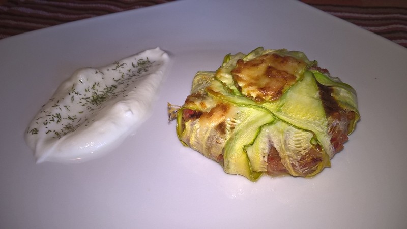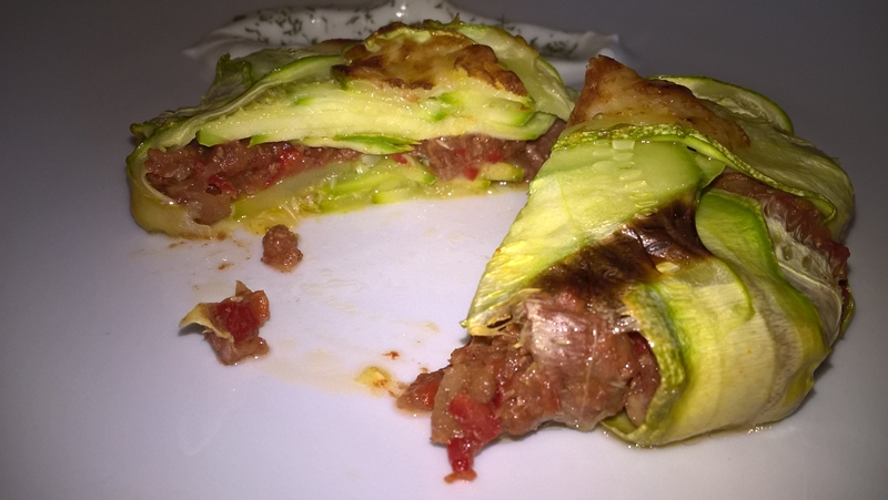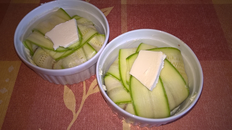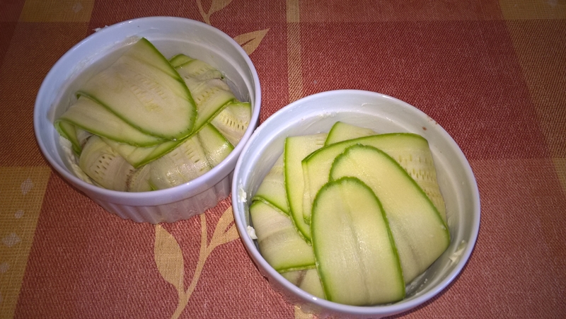 Se tapetează două forme ceramice cu unt (eu am folosit forme cu diametrul de 10cm.), apoi se așează feliile de dovlecel ca în pozele de mai sus (în dreptul ingredientelor). Se pune umplutura și se așează deasupra marginile feliilor de dovlecel. Se pune câte puțin unt și se dau la cuptorul preîncălzit la foc mediu pentru 25 de minute. Se adaugă puțin cașcaval ras și se lasă 5-10 minute până se rumenește ușor.
