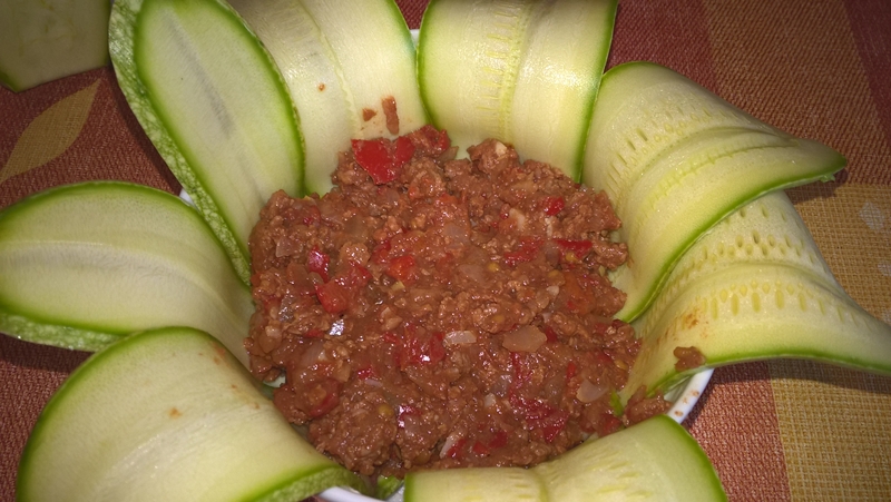 Se toacă carnea de vită cu ceapa și ardeiul. Se pun într-o tigaie antiaderentă, se adaugă roșiile pasate, puțin busuioc și jumătate de cană apă. Se lasă pe foc mic amestecând constant până scade sosul și este bine legat.