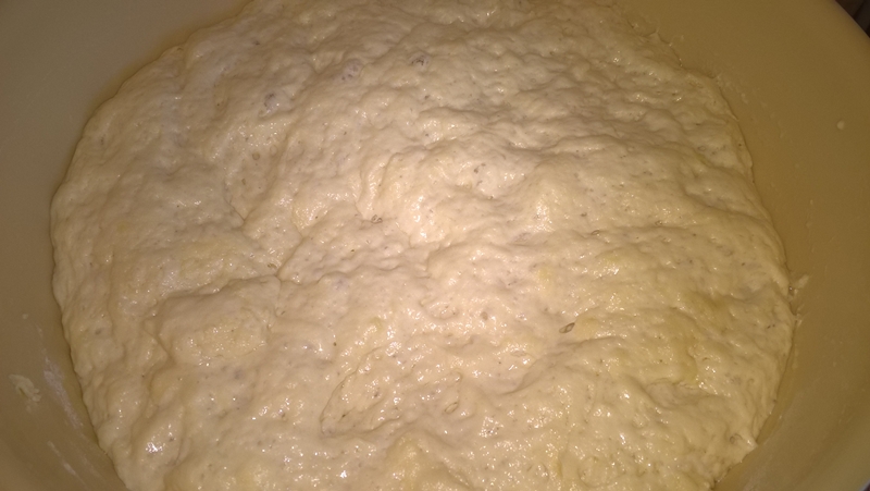 Se pune apa călduță într-un vas, se adaugă drojdia, zahărul brut, sarea și 150g. de făină (o cană). Se încorporează ușor și se lasă 10-15 minute până se activează drojdia. Se adaugă diferența de făină etapizat și se frământă ușor. Se adaugă ulei până se desprinde ușor aluatul de pe mâini.