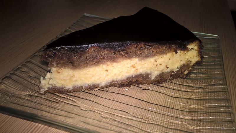 Se pune jumătate din compoziția cu carob, se nivelează ușor apoi se pune compoziția cu brânză. Se pune deasupra cu o lingură compoziția cu carob rămasă și se uniformizează.