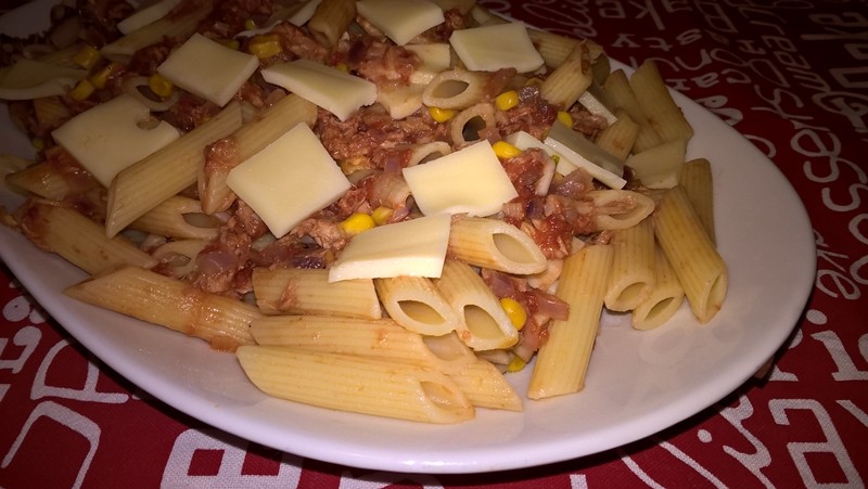 Se curăță ceapa și usturoiul și se toacă mărunt. Se pun într-o tigaie antiaderentă cu sosul de roșii, tonul din conservă și boabele de porumb (am folosit boabe de porumb la conservă). Se lasă pe foc mic până se îngroașă ușor sosul și se înmoaie ceapa și usturoiul. Se adaugă sare după gust și puțin piper.
