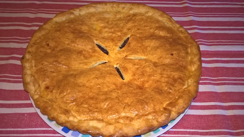Se pune bucata de aluat pe blatul de lucru și se presează puțin cu mâinile. Se pudrează făină deasupra și se întinde foaia, apoi se transferă în tavă ridicând aluatul pe margini și presând ușor. Se presară cele două linguri de pesmet, se așează umplutura și se nivelează ușor. Se pune deasupra a doua foaie (se întinde după procedeul precizat) acoperind bine marginile și se lipesc bine cele două foi.
