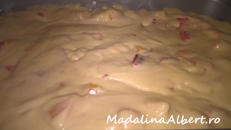 Se bat cele 4 ouă cu zahărul brut cu un tel. Se adaugă untul topit (la temperatura camerei, nu fierbinte), laptele și o linguriță extract de vanilie. Se încorporează făina amestecată cu praful de copt și se adaugă fructele. Se amestecă cu o spatulă și se pune compoziția într-o tavă cu pereți detașabili, tapetată cu unt și hârtie de copt (am folosit o tavă dreptunghiulară cu dimensiunile 28cm.x18cm.)..