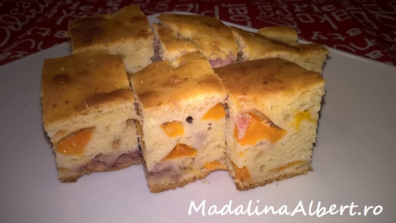 Se curăță caisele de sâmburi și căpșunile de codițe. Se spală bine și se taie cubulețe. Se adaugă 2 linguri de făină peste cubulețele de fructe și se amestecă bine (pentru a fi uniform distribuite la final fructele în toată prăjitura).