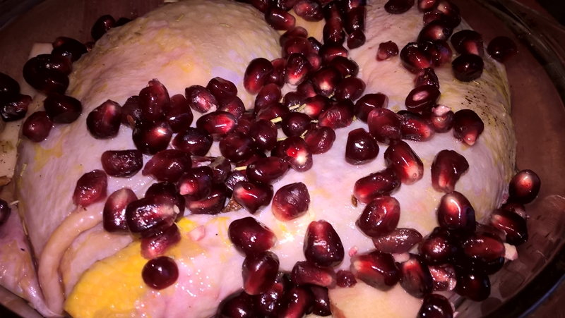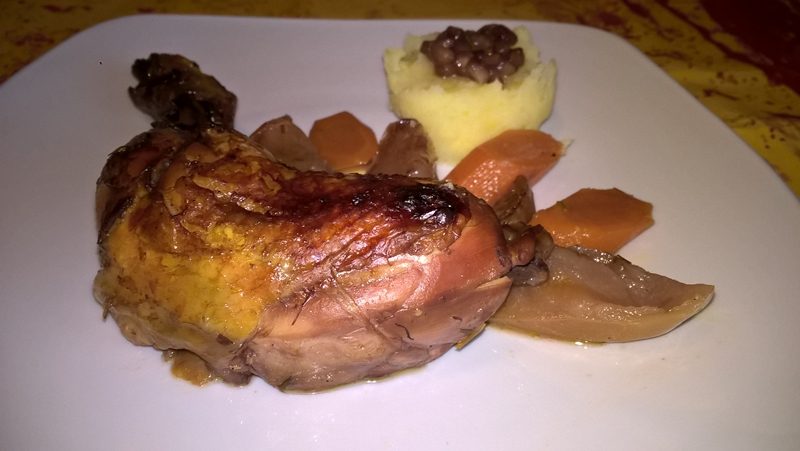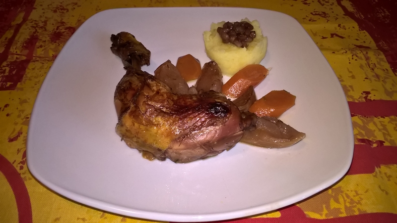 Se curăță morcovul și se taie felii de un deget grosime. Se curăță merele și se taie felii. Se așează feliile de morcov și cele de măr într-un vas termorezistent. Se așează deasupra căței de usturoi curățați, pulpele și se presară sare, rozmarin și piper. Se adaugă zeama de la o portocală și 100ml. de apă. Se presară boabele de rodie, se acoperă vasul și se dă la cuptorul preîncălzit la foc mediu (180 de grade) pentru 30 de minute. Se lasă apoi vasul neacoperit până carnea este făcută și ușor rumenită (aproximativ 30 de minute).