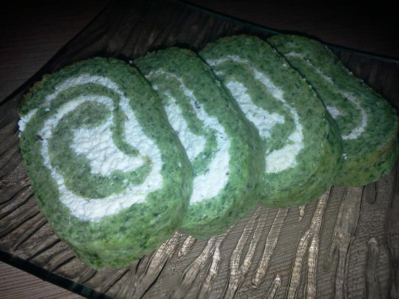 Separat se amestecă brânza de vaci cu smântâna și puțină sare, se adaugă pătrunjelul. Se pune crema de brânză peste foaia de aluat când aceasta este scoasă din cuptor, ușor caldă (nu trebuie să fie rece foaia, se poate rupe când se rulează ulterior). Se rulează și se pune în folie la frigider pentru o oră. Se taie și se servește.