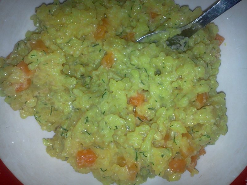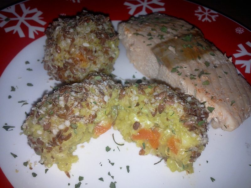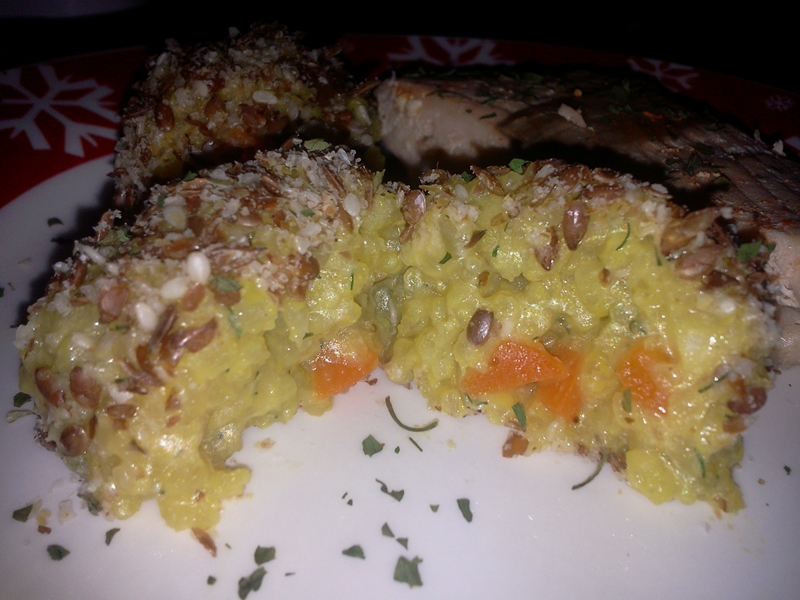 Se pune orezul în apă pentru 1-2 ore. Se clătește bine și se pune la fiert cu ceapă tocată mărunt și morcovul tăiat cubulețe mici. Se adaugă puțin turmeric și se lasă pe foc vasul până este bine fiert orezul și făcute legumele (aproximativ 20 de minute). Dacă mai este nevoie de apă se adaugă câte puțin progresiv (dacă este compoziția prea lichidă la sfârșit trebuie scurs surplusul de apa într-o sită). După ce s-a scurs și compoziția este călduță se adaugă untul, mărarul, sare după gust și fulgii de drojdie inactivă. Se amestecă ingredientele. Se macină semințele și se pun într-un bol. Se trece mâna sub jet de apă, se formează buletele și se trec prin semințe.