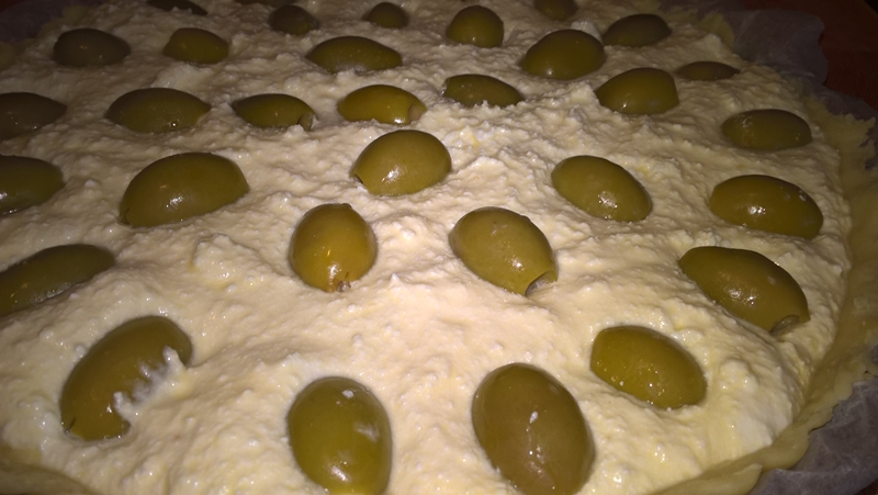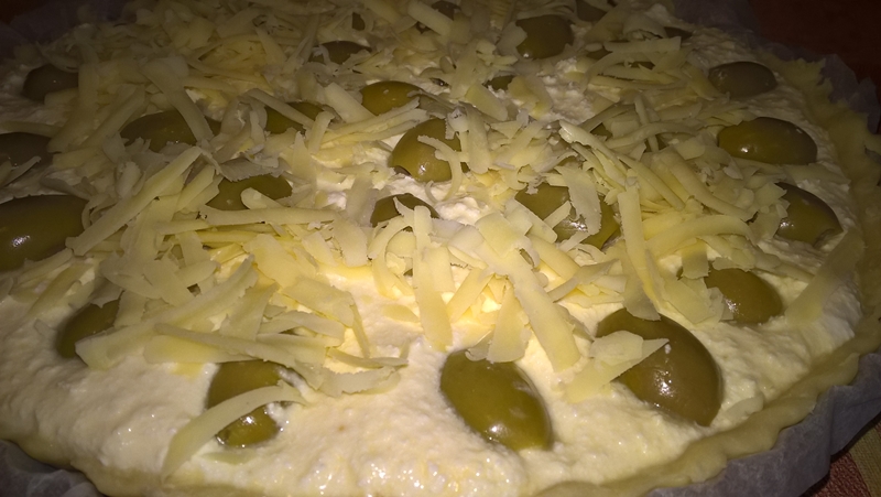 Se pudrează blatul de lucru cu făină și se întinde aluatul. Se transferă foaia de aluat într-o tavă pentru tartă ridicând foaia pe margini și presând ușor. Se decupează surplusul de aluat, se pune umplutura și se așează măslinele. Se presară deasupra brânza Cheddar dată pe răzătoare.