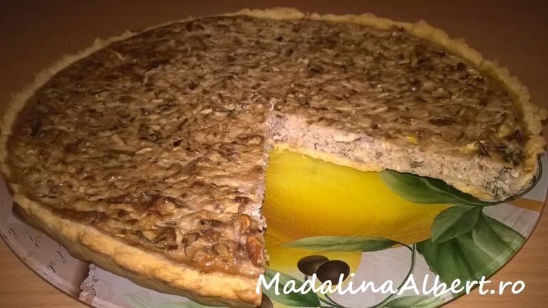 Se dă tarta la cuptorul preîncălzit la foc mediu (180 de grade) pentru aproximativ 45 de minute (până se rumenește frumos). Se lasă tarta la răcit, se porționează și se servește.