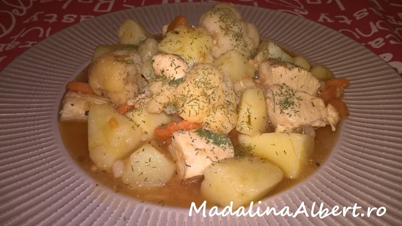 Se taie pieptul de pui cuburi. Se frige înntr-o tigaie antiaderentă fără adaos de ulei sau apă. Se transferă într-un vas și se adaugă ceapa tocată mărunt și morcovii tăiați cubulețe. După aproximativ 20 de minute de când au început să fiarbă ingredientele, se adaugă cartofii tăiați cuburi, buchețelele de conopidă (eu am folosit conopidă congelată – se poate folosi și proaspătă) și roșiile pasate.