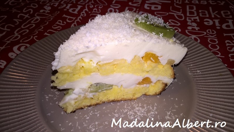 Se dă tortul la frigider pentru 3-4 ore, apoi se îndepărtează marginea detașabilă a tăvii și se ornează cu feliile de la 2 kiwi și fulgii de cocos.