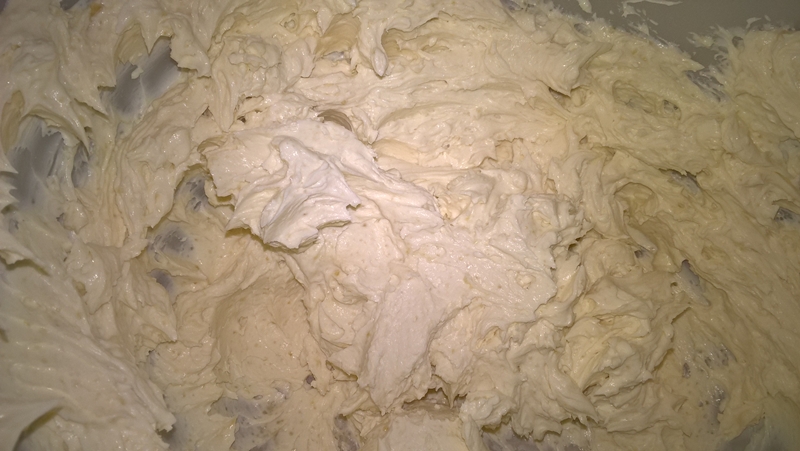 Se pune mascarpone într-un vas și se mixează cu 50g. zahăr (se folosește mascarpone rece) până acesta este bine încorporat (nu se mixează prea mult pentru a nu se tăia crema). Se mixează smântâna rece cu 50g. zahăr până acesta este bine încorporat. Se amestecă cu o spatulă crema de mascarpone cu smântâna.