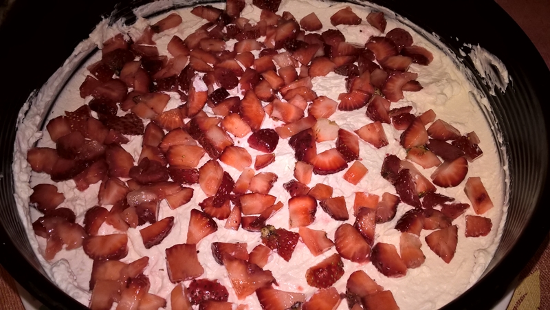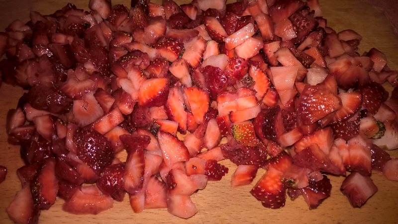 Se spală căpșunile și se taie cubulețe (eu am folosit 200g. de căpșuni din cantitatea precizată la ingrediente pentru ornat – le-am tăiat felii subțiri).