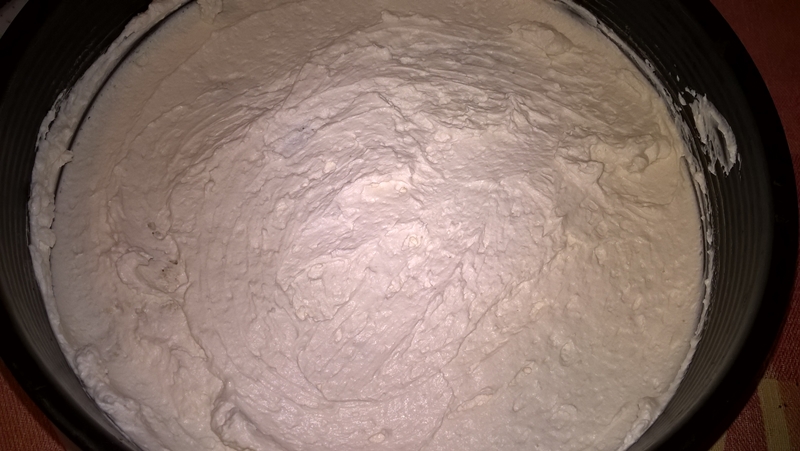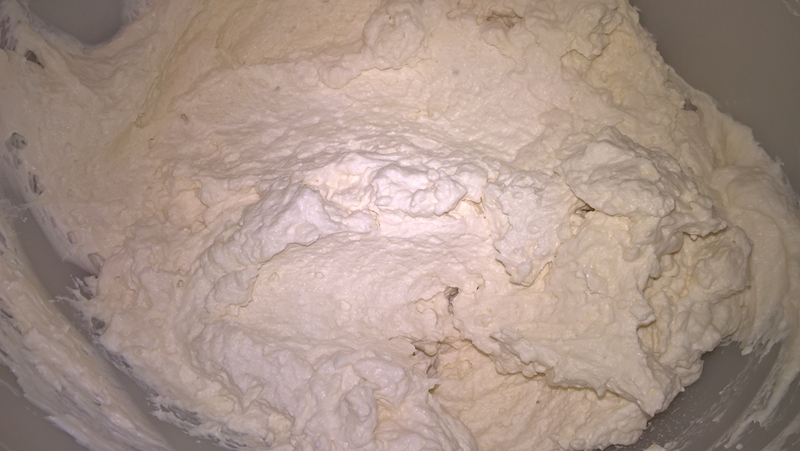 Se bat albușurile spumă, se adaugă zahărul și se mixează până se obține o consistență ca pentru bezele (dacă se întoace bolul nu curge compoziția).