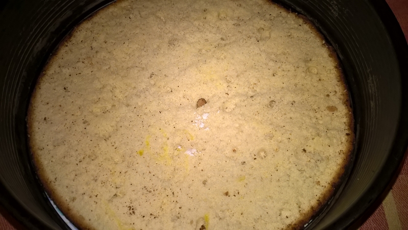 Se adaugă toate gălbenușurile și apa amestecând ușor. Se cerne făina și se adaugă treptat. Se amestecă ușor până este bine încorporată. Se pune compoziția în forma tapetată și se bate ușor până se așează uniform. Se dă forma la cuptorul preîncălzit la foc mediu pentru 30-40 de minute (până trece testul scobitorii). Nu se deschide cuptorul timp de 15-20 de minute pentru a rămâne aerat blatul. Când este gata se scoate din formă și se lasă la răcit.